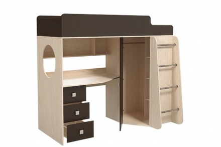 Вашему ребёнку несомненно понравится спать на кровати-чердаке, куда нужно залезать по лестнице и окошко-иллюминатор у стола.