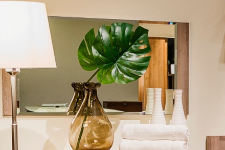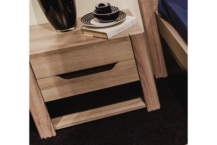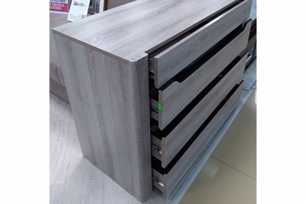 Интересное дизайнерское и конструкторское решение - отсутствие ручек. Мягкий эффект усилен сглаженными углами на всех элементах мебели, фигурными выемками для открывания ящиков и дверей и бархатной подложкой в верхнем ящике комода. На ящиках тумбы шариковые направляющие с бесшумным открыванием.
