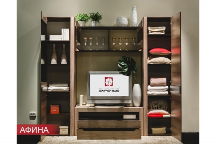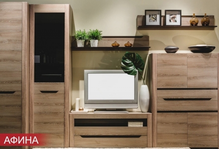 Модульная серия Афина выпускается в гостиной и спальне в двух декорах: Ясень таормина и Дуб Крафт Табачный.