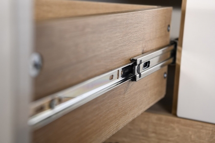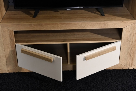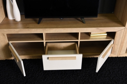 Открытые ниши пригодятся для необходимой аппаратуры. Два отделения с дверцами и вместительный выдвижной ящик созданы для аккуратного хранения всех важных предметов. Простые, но одновременно элегантные и практичные навесные полки позволят красиво разместить семейные фотографии, увлекательные книги и разнообразные декоративные предметы.
