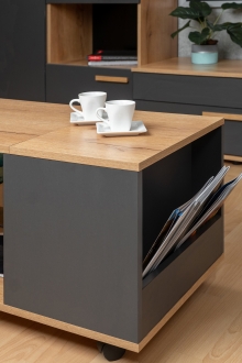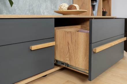 Гостиная Crown - лучшее решение для организации гостиной в стиле лофт. Каркас мебели выполнен в декоре дуб золотистый, фасады в цвете графит украшены вставками, похожими на вкрапление янтаря. Фурнитура геометрической формы добавляет мебели стиля и выглядит эффектно. Всего нескольких модулей будет достаточно, чтобы организовать зону хранения и ТВ-зону в гостиной. Особенности: трендовый дизайн,хорошая вместимость,разноплановое наполнение модулей,универсальная сборка шкафов.