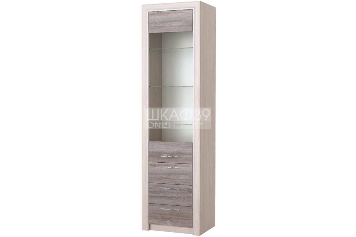 Пенал-витрина одностворчатый с 3-мя ящиками на шариковых направляющих полного выдвижения. Обрамление корпуса - профиль МДФ с серебристой патиной. Металлические ручки. В пенал устанавливаются 3 стеклополки с возможностью установки светодиодной подсветки.