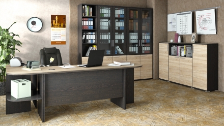 Мебельный комплект, оформленный в респектабельном стилевом решении и эффектном сочетании оттенков натуральной древесины «Дуб Сонома» и «Венге Цаво», обеспечит максимальную функциональность кабинета руководителя, создав комфортную рабочую обстановку.