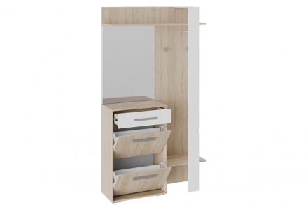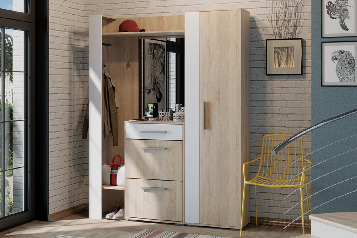 Прихожая оснащена вместительной тумбой, где есть выдвижной ящик для мелочей и две удобных обувницы. Есть также дополнительное открытое пространство для обуви в нижней части. Для верхней одежды есть два крючка и дополнительная металлическая штанга. На верхней полке можно расположить головные уборы, а на нижней другие необходимые аксессуары.