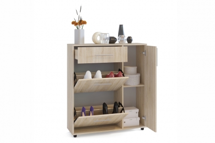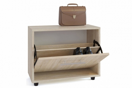 Компактная тумба для обуви, шириной 600 мм. Дверь тумбы оснащена откидывающимся механизмом со специальными полками для размещения обуви, который обеспечивает удобство хранения и легкий доступ к необходимой паре кроссовок или туфлей.