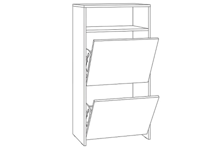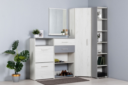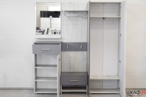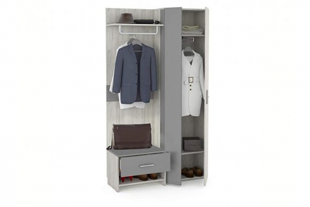 Внутреннее наполнение состоит из широкой ниши со штангой, глубокой антресоли и двух полок для размещения обуви и сумок.