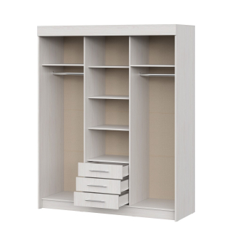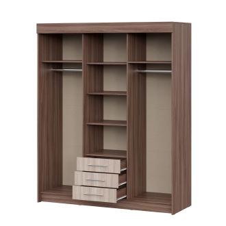 Со шкафом-купе Фортуна Вы организуете продуманное хранение любой одежды: от вещей в сложенном виде до деликатных изделий, которые необходимо хранить на плечиках. Ящики можно использовать для постельного белья, аксессуаров и других личных вещей. Особенности ЛДСП с древесным рисунком ручка – хромированный пластик зеркало с фацетной обработкой края роликовые направляющие на ящиках