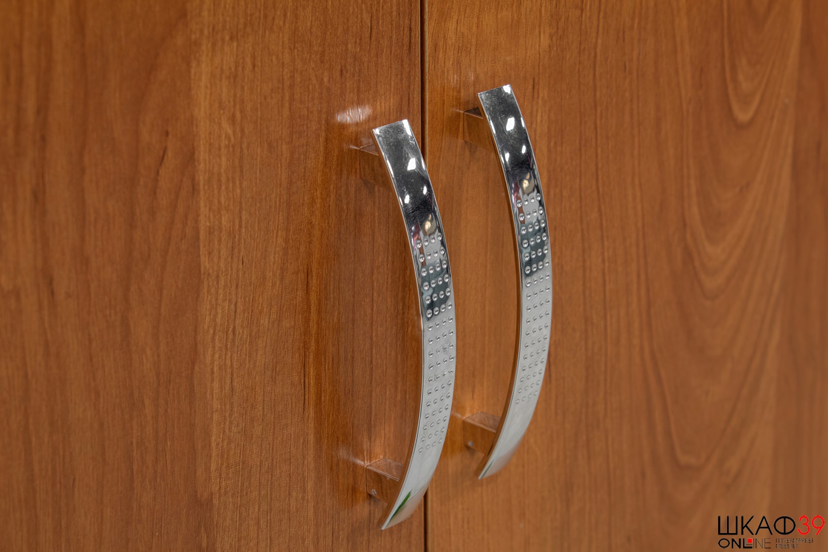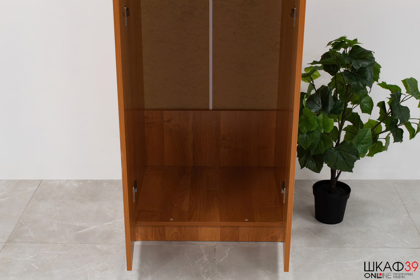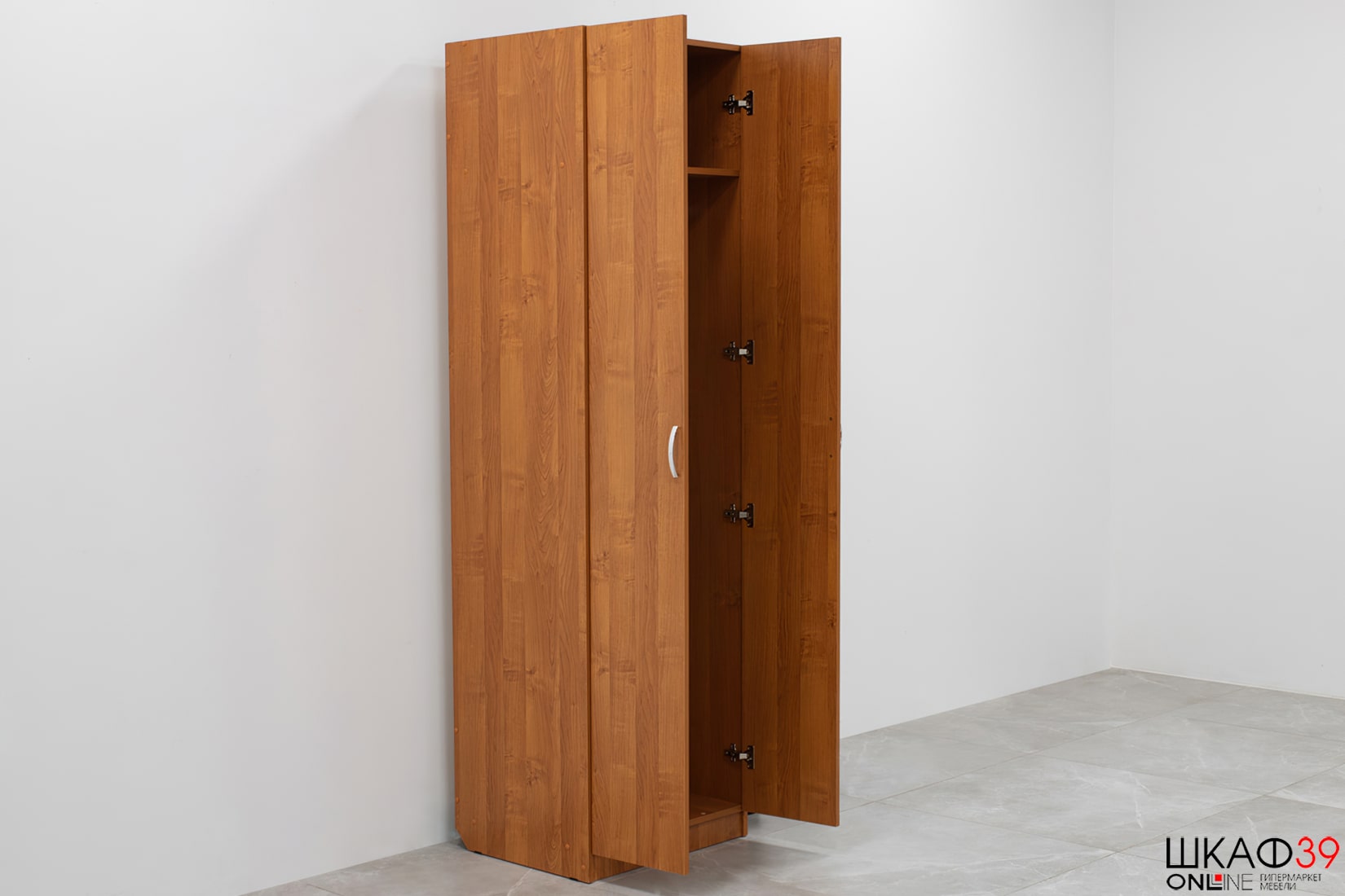 Распашной двухдверный шкаф оборудован большим отсеком для вещей на плечиках (установлена штанга), в верхней части имеется глубокая полка для крупногабаритных вещей. Распашные дверки оборудованы дугообразными ручками и отличаются лаконичным дизайном..