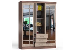 Боковые отделения декорированы зеркалами и оснащены штангой для вешалок и полкой, центральное отделение - тремя полками.