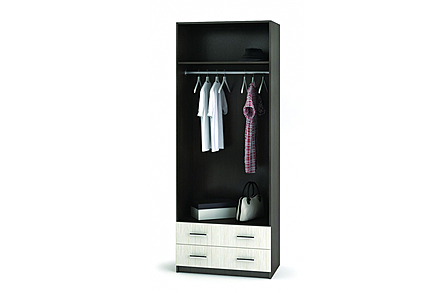 Шкаф разделен на 2 части: верхняя предназначена для верхней одежды на плечиках, нижняя с выдвижными ящиками — для белья.