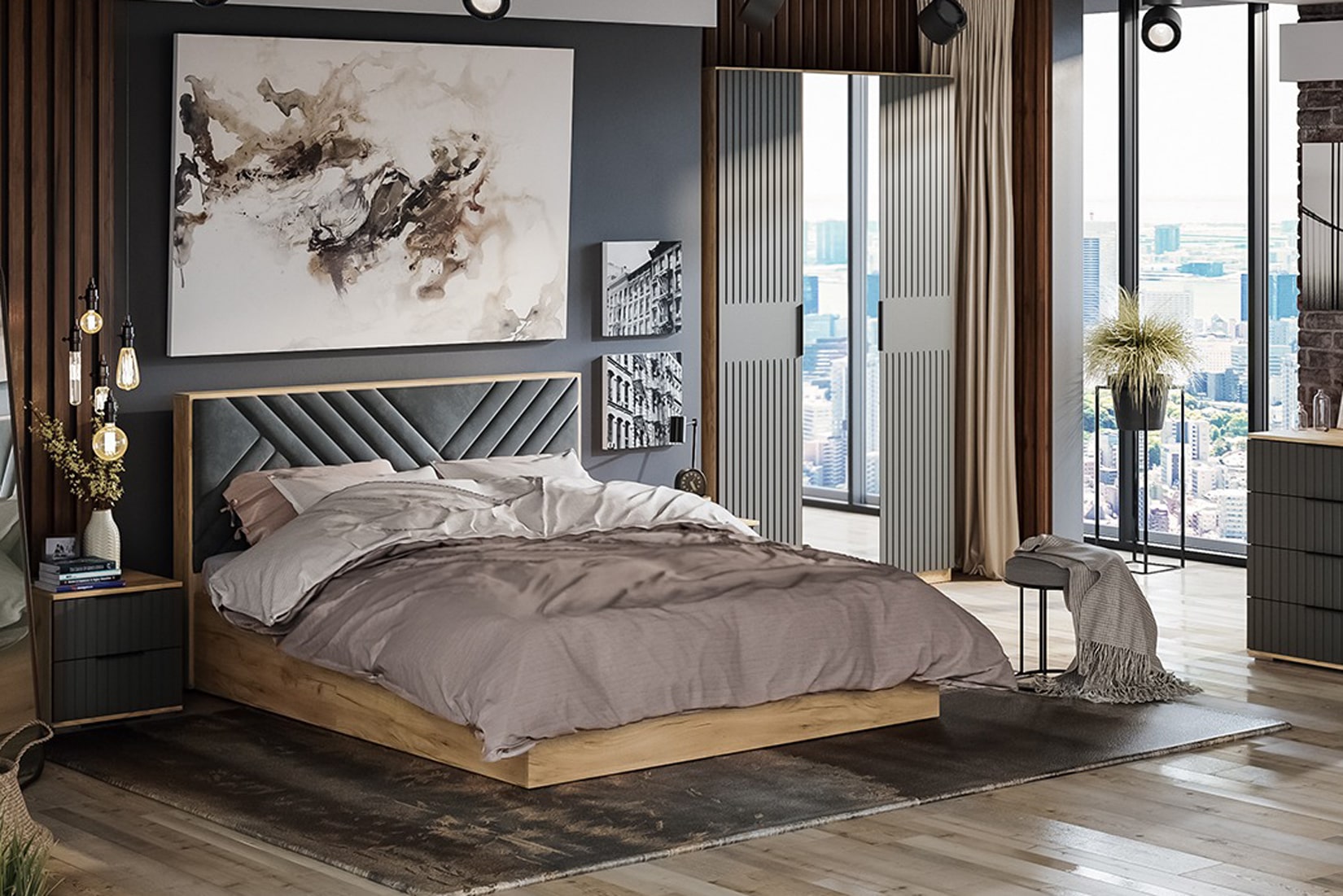 Спальня Хилтон поможет обустроить уютную комнату, в которой вы сможете расслабиться и ощутить домашнее тепло. Кровать предоставит необычайно удобное спальное место, где вы после трудных и насыщенных дней сможете расслабиться, отдохнуть и набраться сил. Мягкое изголовье из велюра позволит комфортно расположиться перед сном и почитать интересную книгу или посмотреть сериал на планшете. Прикроватные тумбы позволят держать все важные и необходимые предметы около кровати. Вместительные выдвижные ящики пригодятся для хранения книги для чтения перед сном, маски для беззаботного сна и крема для увлажнения рук. За распашными дверьми 3-х створчатого шкафа справа находится широкая штанга для вешалок-плечиков. Полки, скрытые в левой части шкафа, пригодятся для размещения сложенной одежды, постельного и нижнего белья, различных аксессуаров и коробок с обувью. Мебель Хилтон - выбор современных и активных молодых людей, предпочитающих удобство, комфорт и оригинальность.