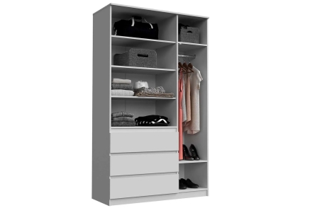 Челси Шкаф 1200 + антресоль 1200 — распашной шкаф с 3 дверьми, за которыми расположены секция со штангой, полкой для обуви и антресольной полкой и секция с 3 полками и 3 ящиками. Шкаф укомплектован антресолью с 3 дверьми.