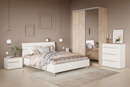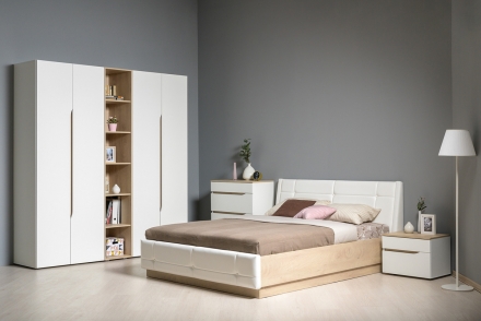 Коллекция Муссон - это практичное и уютное решение для спальни. Мягкое изголовье изголовье кровати установлено с небольшим наклоном, что добавляет возможность не только лежать в кровати, но и комфортно сидеть, как на диване. Ортопедическое основание - отличная основа для современных матрасов. Подъёмный механизм обеспечивает удобный доступ к системе хранения. Комод и тумба выполнены в глянцевом белом МДФ с широкой декоративной фаской по граням изделий. Миниатюрные выдвижные ящики прикроватной тумбы открываются простым нажатием на фасад. Ручки-вырезы комода позволяют легко открывать даже сильно нагруженные ящики.