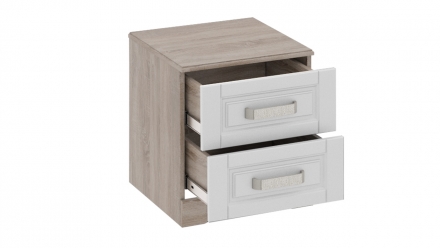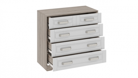 Коллекция “Прованс” оформлена в классическом французском стиле - теплый древесный оттенок каркаса в сочетании с фрезерованными фасадами. Уникальное и превосходное сочетание цветов, популярный декор Дуб Сонома в новом, эксклюзивном исполнении “Трюфельный” в сочетании с кремовым оттенком фасада с эффектом перламутра. Все видимые поверхности выполнены из фрезерованного МДФ – это фасады, включая дверь с зеркалом, столешницы тумб и комодов, даже цоколя серии “Прованс” изготовлены из МДФ с идеально подобранной фрезеровкой.