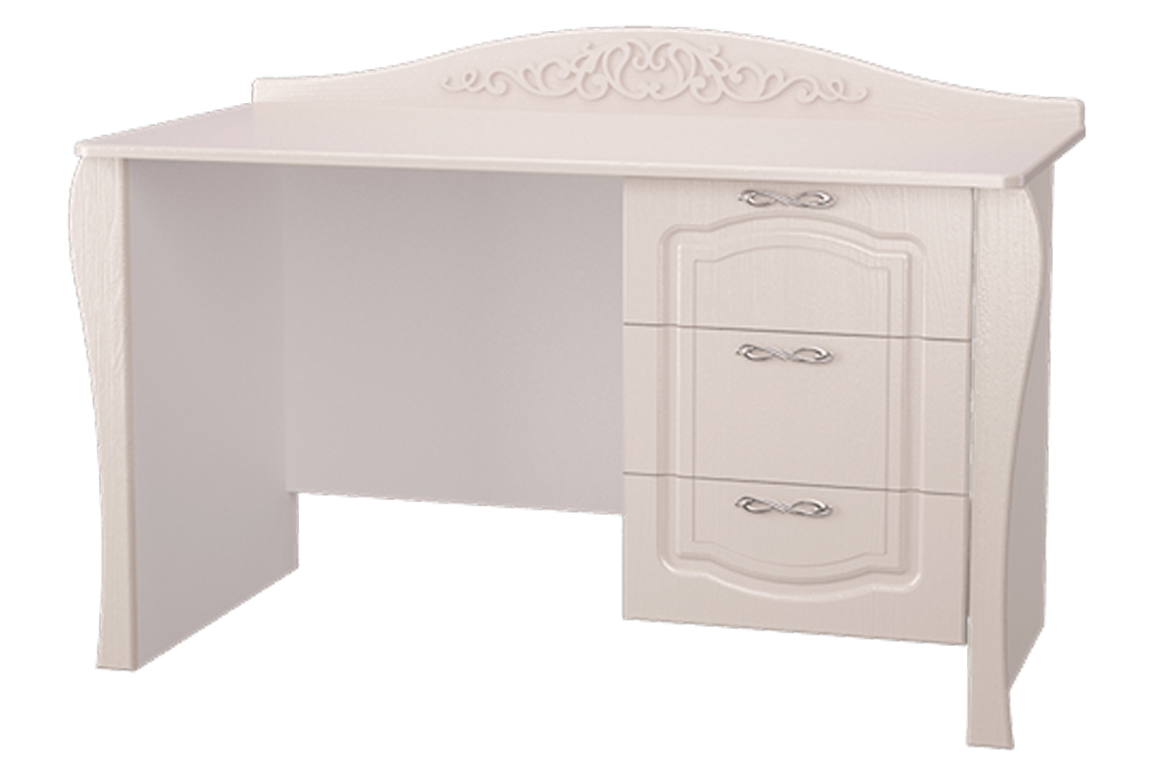 Ищете классический стол для работы или учебы? Модель Виола придется по душе ценителям элегантной и утонченной мебели. Корпус изделия выполнен из ЛДСП в мерцающем декоре 'жемчуг', а резные фасады ящиков - из МДФ в защитной пленке ПВХ. Эксклюзивные дизайнерские ручки не только красивы, но и удобны при ежедневном использовании. Шариковые направляющие обеспечат полное, плавное и бесшумное закрывание ящиков и прослужат ни один год.